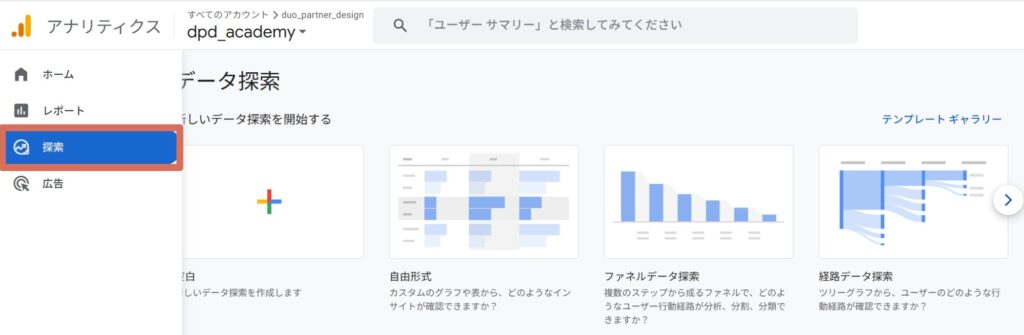 「探索」画面には、自由形式・ファネルデータ探索・経路データ探索が一覧で表示されます。