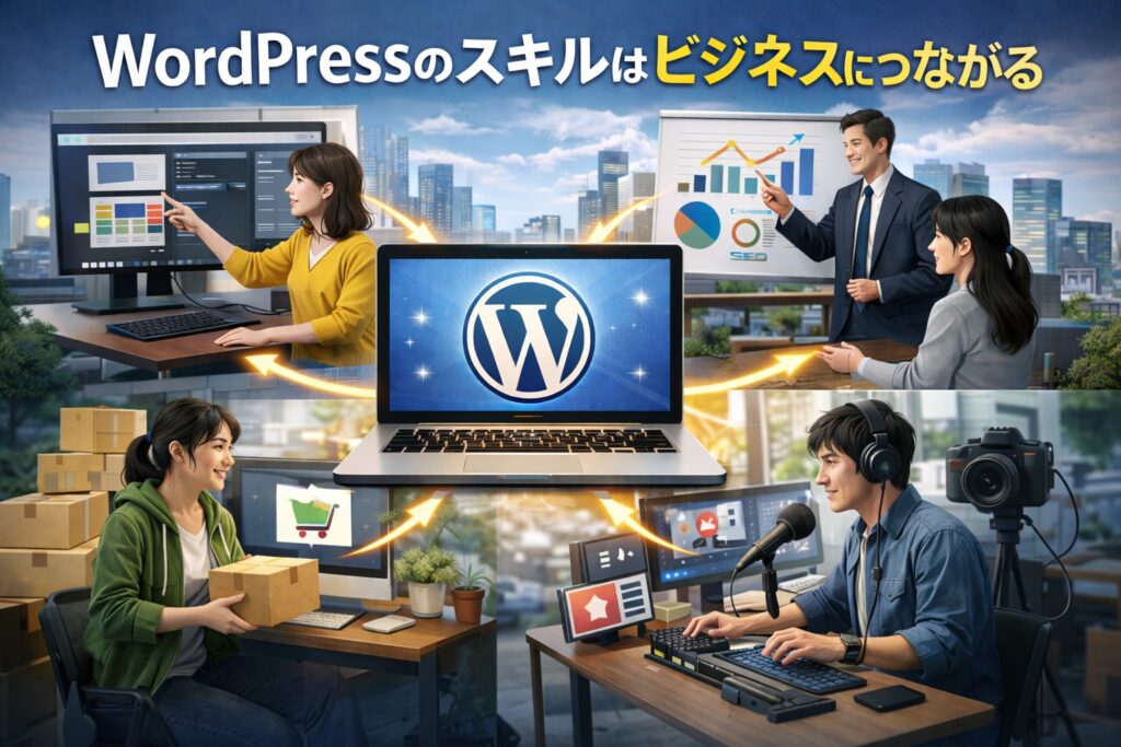 そのため、WordPressの基礎を理解しているだけで、実務につながる場面が一気に増えます。